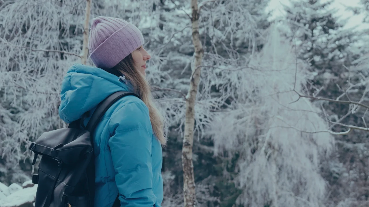 Pierwsza wyprawa w Góry Świętokrzyskie przy idealnej, zimowej aurze. Świeży śnieg, oszronione drzewa i przebijające słońce stworzyły doskonałe warunki do zdjęć. W postprodukcji wzmocniłem ten klimat, dodając nieco chłodu w cieniach. Kolor ubrań – błękitna kurtka i fioletowa czapka – pozwolił uzyskać na tle bieli estetyczną, pastelową paletę barw.